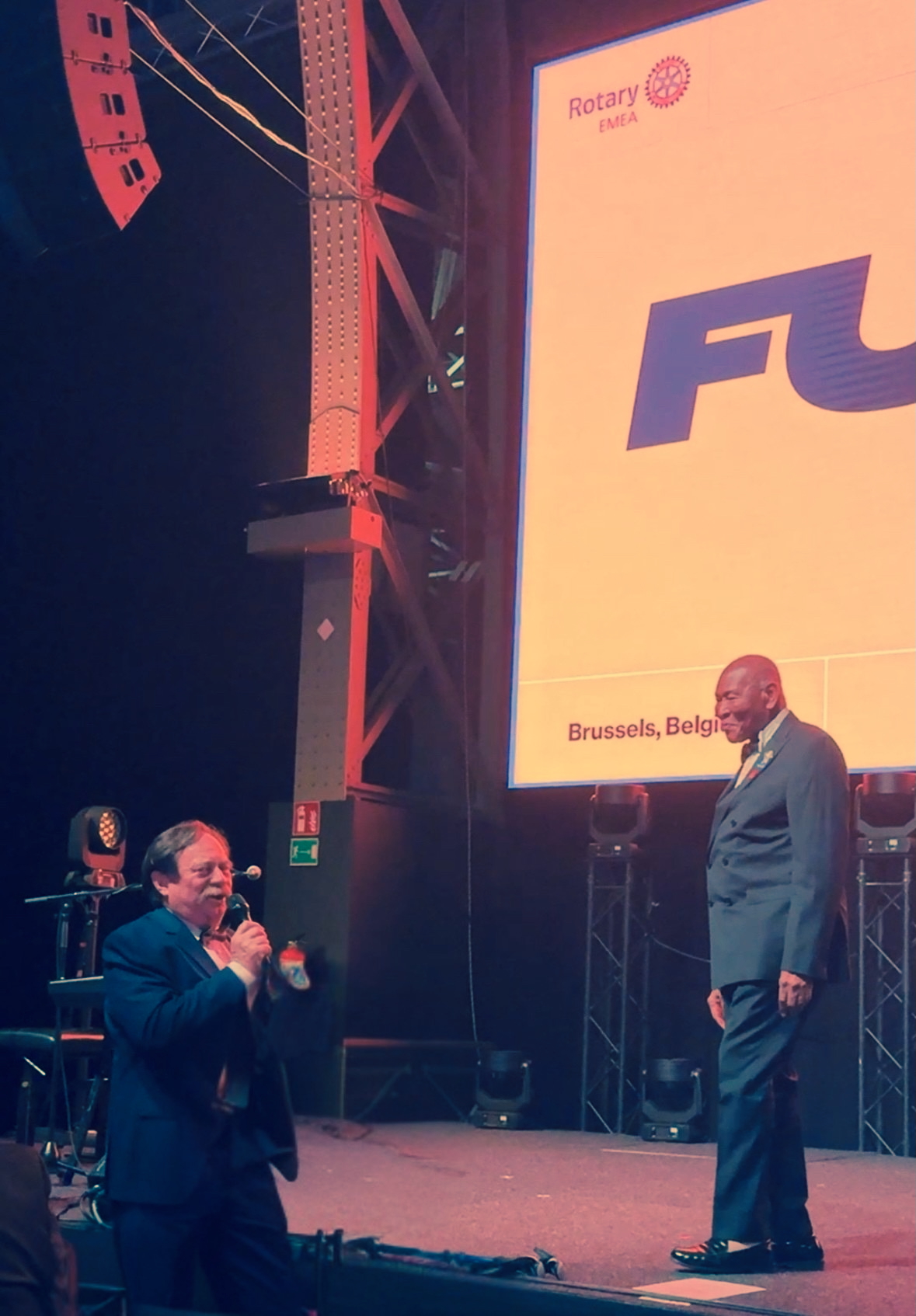 Kulminacyjnym punktem FUSION 2025 była uroczysta kolacja i gala, która odbyła się 27 września w brukselskim muzeum samochodów Autoworld. Wśród zabytkowych aut, przy dźwiękach muzyki i w atmosferze przyjaźni, rotarianie z całego świata świętowali wspólne wartości i sukcesy. Wszystkich gości częstowano wykwintnymi daniami i winem. Ten wieczór stał się również okazją do wyjątkowego powitania przez Prezydenta Elekta RI Olayinki Hakeema Babaloli z RC of Trans Amadi, Rivers State, Nigeria, jednego z najbardziej zasłużonych rotarian PRID Sama Okudzeto z Rotary Club of Accra z Ghana, obchodzącego 58-lecie członkostwa w Rotary oraz 90. urodziny. Koledzy rotarianie odśpiewali mu „Happy Birthday” w swoich językach, nie zabrakło również polskiego „Sto lat” w wykonaniu PDG Andrzeja Ludka z RC Warszawa City. Występ chóru, którego anielskie głosy stały się perełką wieczoru zachwyciły publiczność do tego stopnia, że na zakończenie koncertu uczestnicy podziękowali artystom owacją na stojąco.