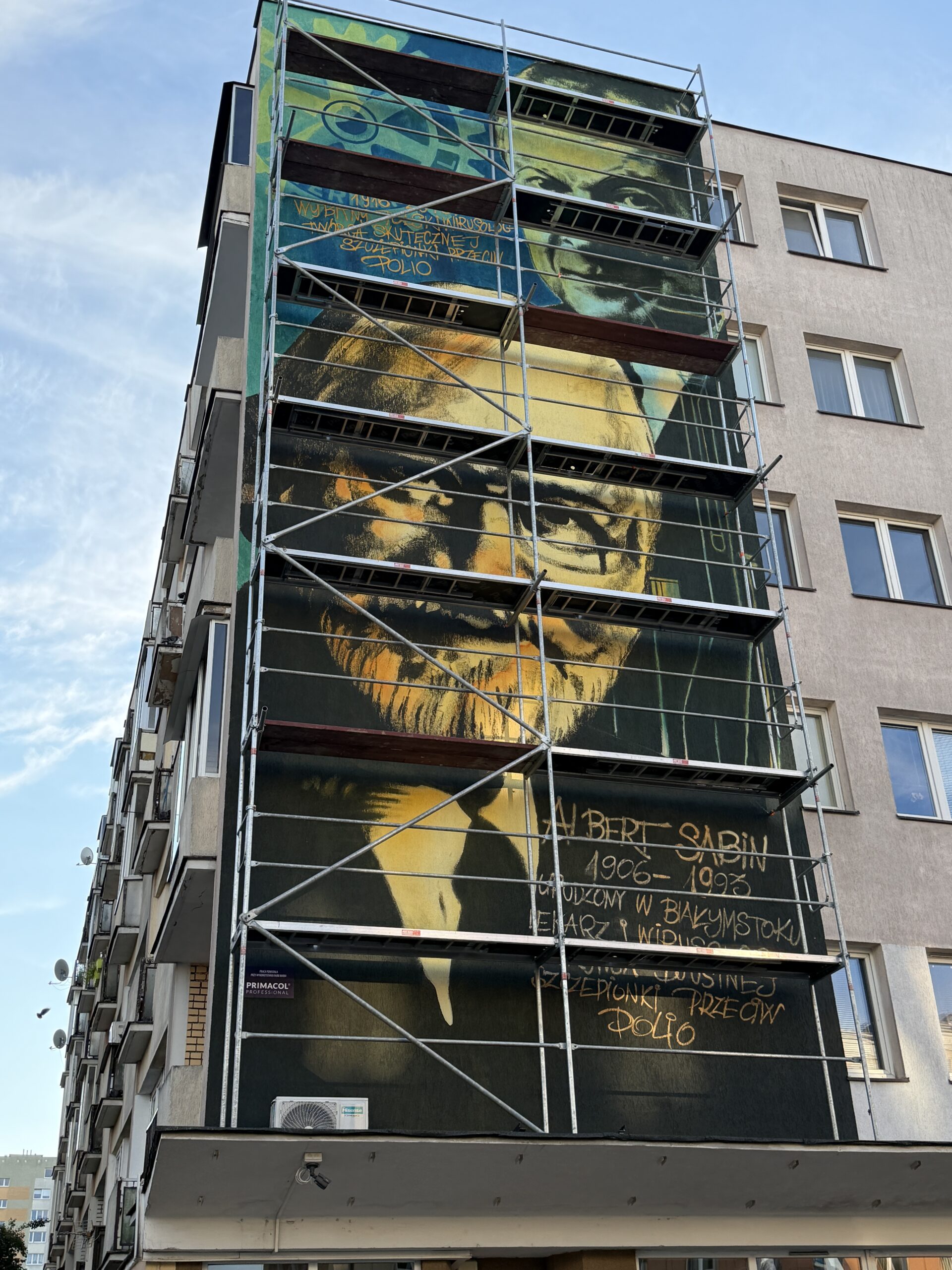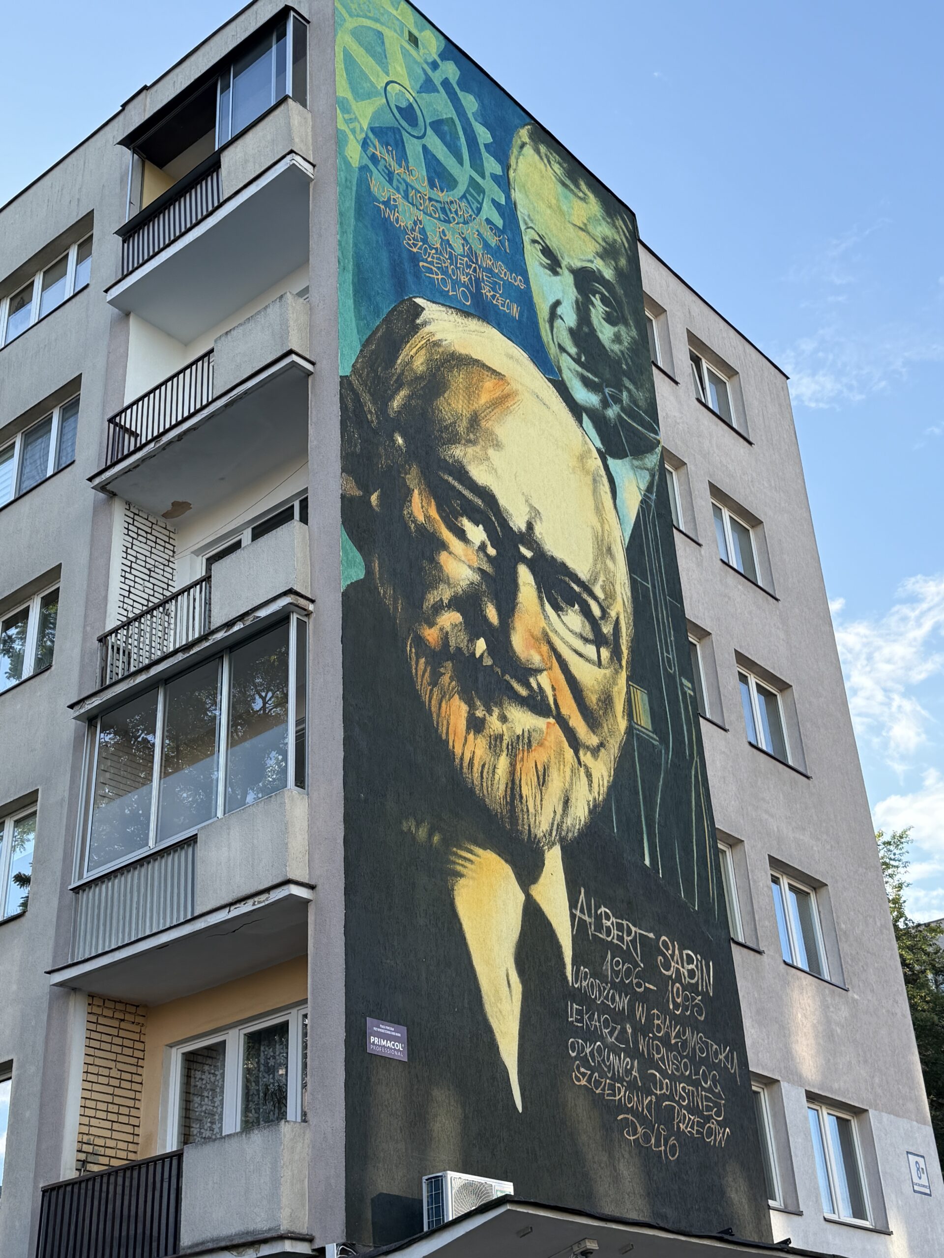 Nasz Klub Rotary Białystok postanowił pamięć o tych dwóch wielkich naukowcach pochodzących z Polski uczcić i w prominentnej lokalizacji przy ulicy Skłodowskiej 8, na szczycie bloku, obok budynki Książnicy Podlaskiej oraz Urzędu Marszałkowskiego oraz przy głównej ulicy biegnącej do białostockiego kompleksu szpitalnego, umieścić mural. Autorem koncepcji i głównym motorem od strony organizacyjnej jest Radosław Harasim oraz Past Prezydent Klubu Rotary Białystok Bartłomiej Sawulski oraz Marcin Dolida. To oni znaleźli miejsce, zorganizowali zarówno materiały jak poczynili uzgodnienia z odpowiednimi służbami jak i samorządem mieszkańców. Wysokiej jakości farbę odporną na zmienne warunki pogodowe, specjalistyczną do przygotowania murali przekazała firma Primacol Decorative a system rusztowań Konceptbud. Zadbaliśmy także aby twórcą muralu został uznany, jeden z najbardziej znanych „muralistów” w Polsce, założyciel Gdańskiej Szkoły Muralu, Dr Rafał Władysław Roskowiński. Otwarcie Muralu planujemy 24tego Października w Dzień Walki z Wirusem Polio. Ale nie czekając na ten dzień materiały o naszym muralu pojawiły się już w otoczeniu medialnym! Zarówno TVP Białystok, Polskie Radio Białystok jak i Kurier Poranny zamieściły materiały o naszej inicjatywie!