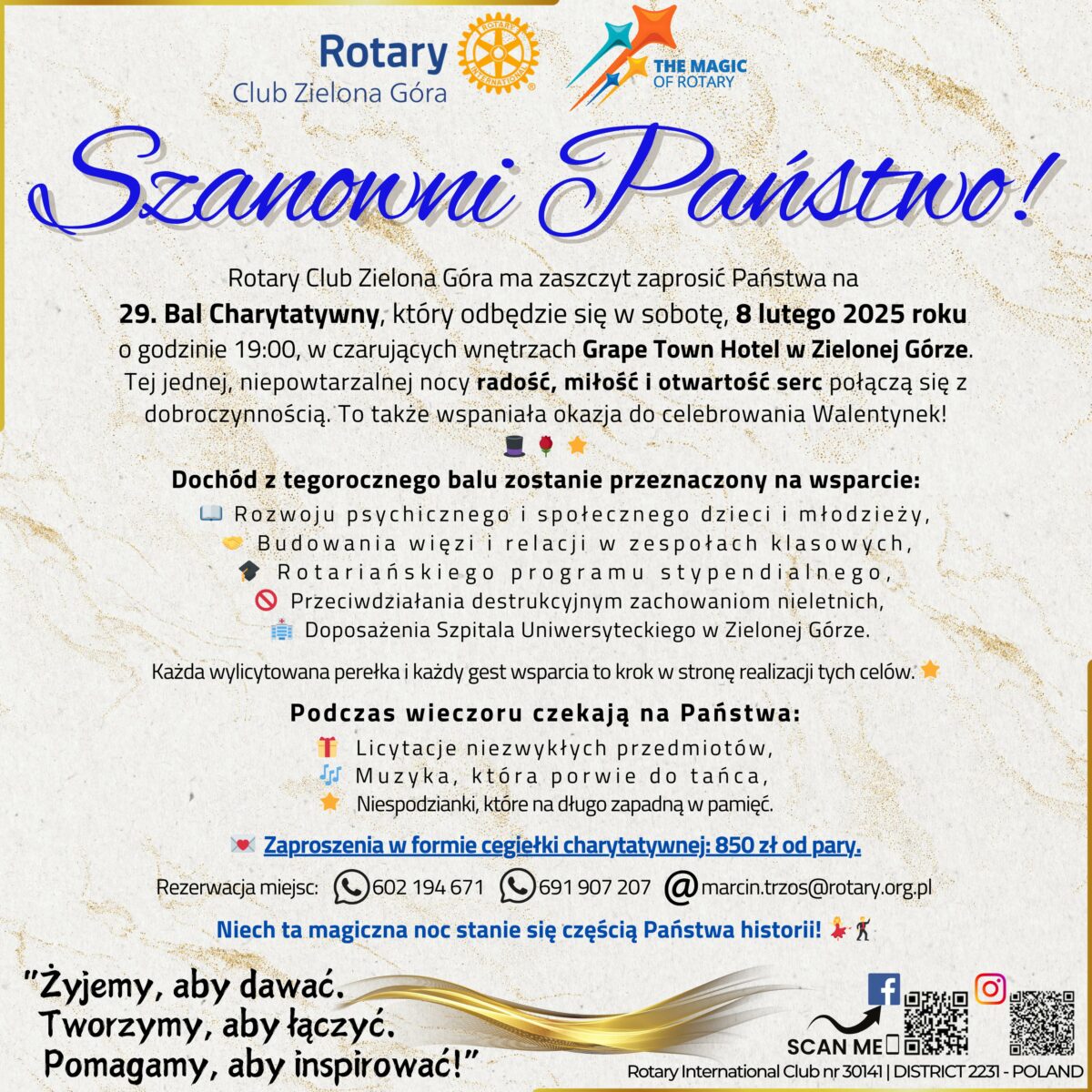 Rotary Club Zielona Góra ma zaszczyt zaprosić na najbardziej wyczekiwane lokalnie rotariańskie wydarzenie roku – 29. Bal Charytatywny Rotary Club Zielona Góra.  To wyjątkowe wydarzenie, na którym nie może Was zabraknąć.
