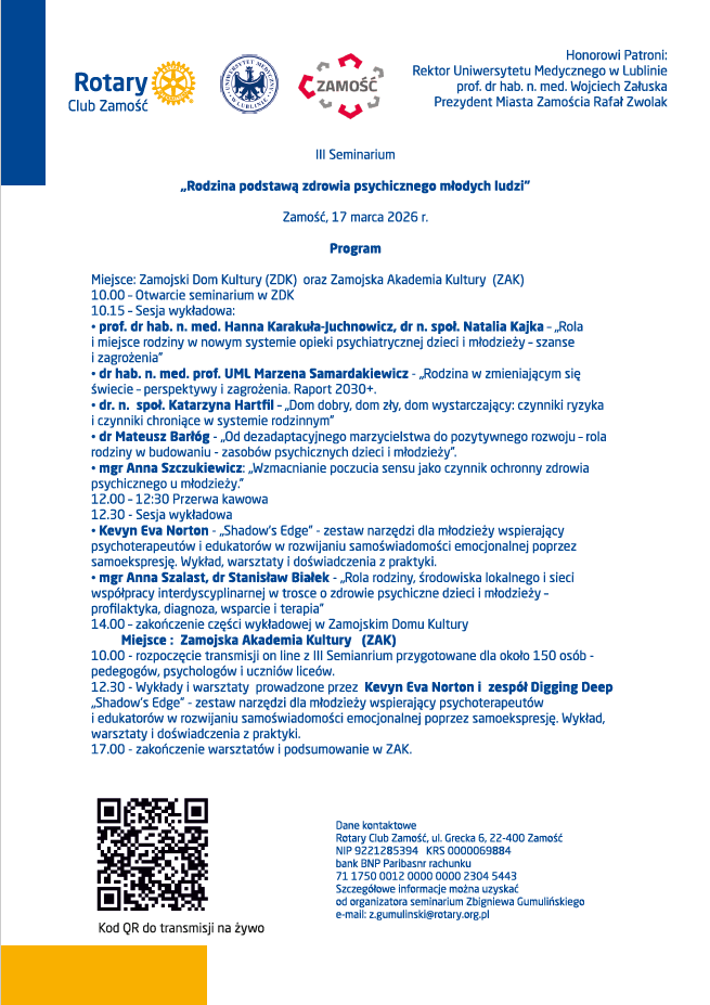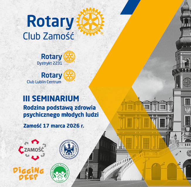 Rotary Club Zamość ma zaszczyt zaprosić Państwa na III Seminarium z cyklu dotyczącego zdrowia psychicznego dzieci i młodzieży. Tegoroczna edycja, zatytułowana „Rodzina podstawą zdrowia psychicznego młodych ludzi”, skupia się na kluczowej roli systemu rodzinnego w zapobieganiu kryzysom psychicznym oraz wspieraniu rozwoju młodych osób.