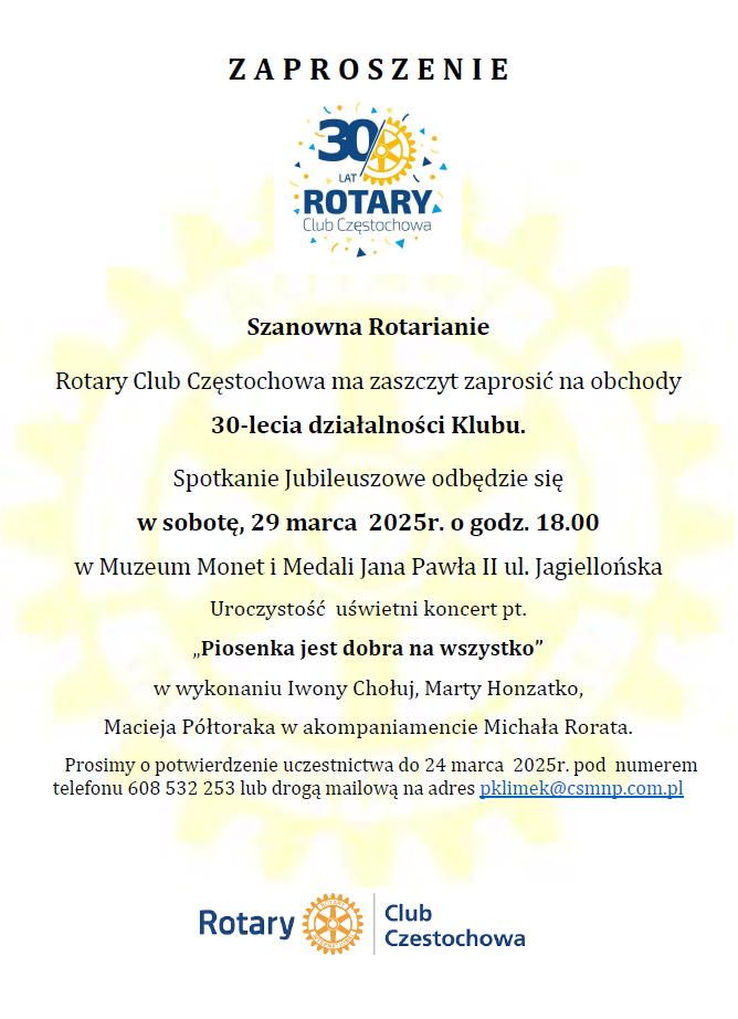 Rotary Club Częstochowa ma zaszczyt zaprosić na obchody