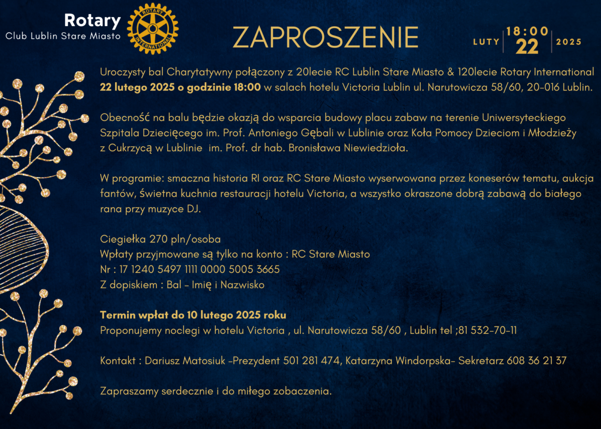 Z okazji 20-lecia Rotary Club Lublin Stare Miasto oraz 120-lecia Rotary International mamy zaszczyt zaprosić Państwa na Uroczysty Bal Charytatywny.
