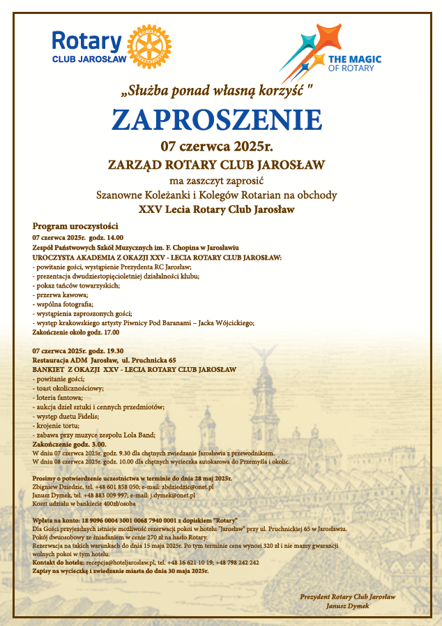 Rotary Club Jarosław zaprasza w terminie 7- 8 czerwca 2025 roku na uroczystość XXV-lecia działalności klubu.