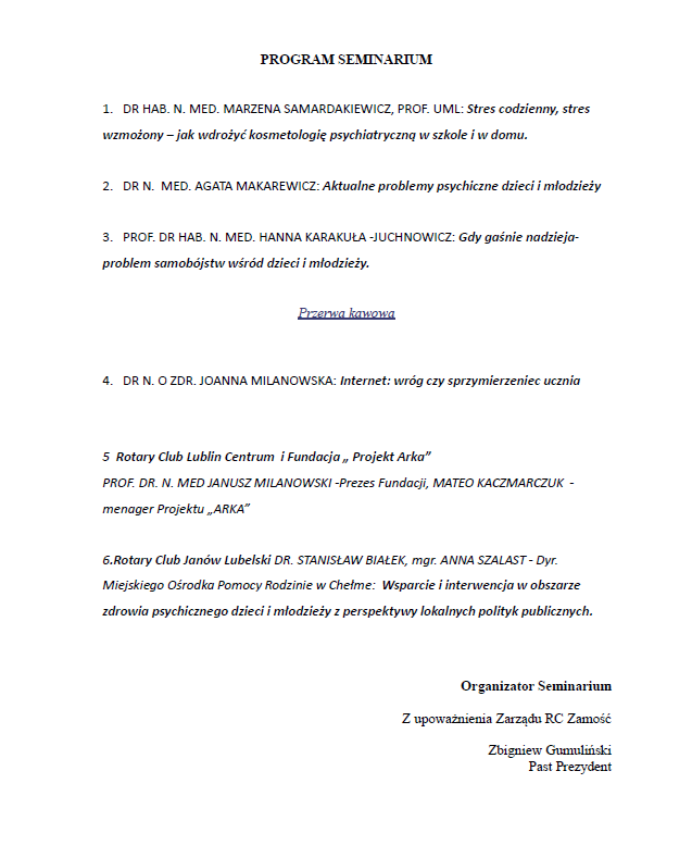 Past Prezydent Rotary Club Zamość Zbigniew Gumuliński zaprasza do wzięcia udziału w Seminarium: