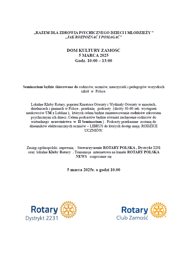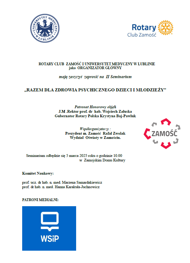 W odpowiedzi na te niepokojące trendy, mamy zaszczyt zaprosić Państwa do udziału w II Seminarium „Razem dla zdrowia psychicznego dzieci i młodzieży”, organizowanym przez Rotary Club Zamość i Uniwersytet Medyczny w Lublinie.